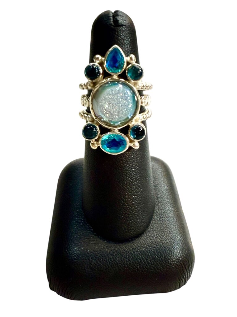 SS DRUZY BEZEL SET CTR W/ PEACOCK QUARTZ CAB TOPAZ STONES ADJUSTABLE BAND SZ 6