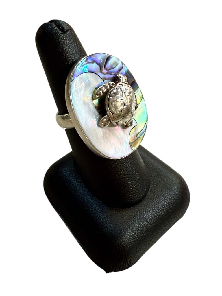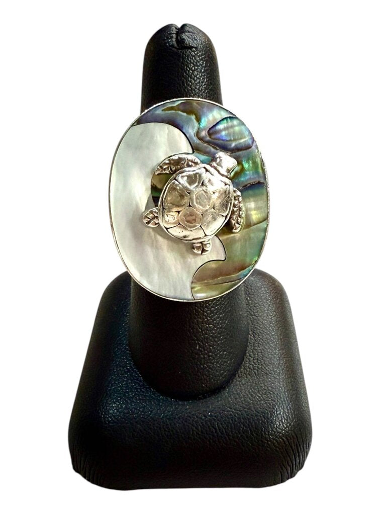 SS LG OVAL BEZEL SET GREEN TURQ RING SZ 6