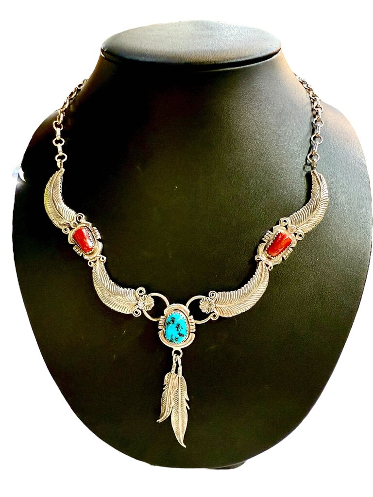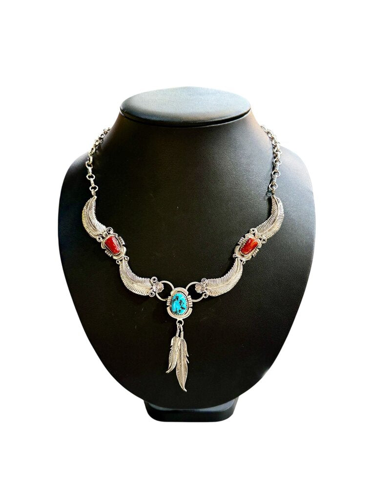 SS NAVAJO "RUNNING BEAR" NECKLACE TURQ CORAL FEATHERS