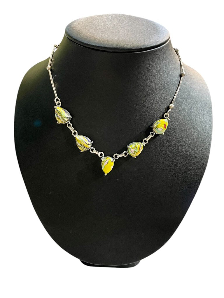 SS RAINBOW CALSILICA JASPER PEAR SHAPE STONES CHEVRON SHAPE NECKLACE